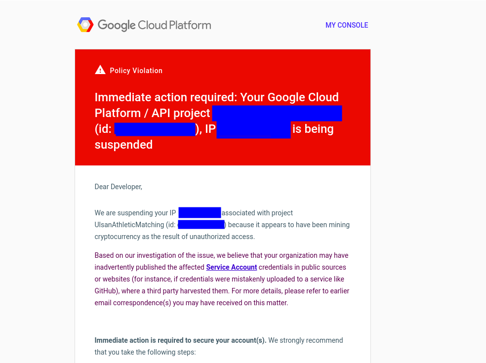 오후 10시까지 열심히 코딩을 하고 git push를 하고 정보처리기사 공부를 하고 있었는데 1시간 뒤에 갑자기 울리는 내폰의 알림 . . . . 난 공부할 땐 폰의 모든 알람을 꺼두지만 갑자기 울리기에 불안한 기운이 음습했다. 휴대폰을 보니 아니나 다를까... 뭔가 진짜 X된거 같은 빨간 화면이 나타났다. 누가 내계정으로 vm 하나 파서 암호화폐 채굴했다는 내용이 였다. 나는 바로 내가 한게 아니라고 구글님께 메일을 쏘고 콘솔창을 확인하러 갔다 난 구글꺼 인스턴스 써본 적도 없는데 이렇게 범인의 흔적이 있었다. git add --all 하는 습관이 되어 있어서 인증키도 같이 깃에 빨려 들어갔나보다. 이렇게 바로 메일로 알려 주셔서 갓구글님 감사합니다ㅠㅠ 다음부터 이런 일 없도록 보안에 신경 써야 할 것..